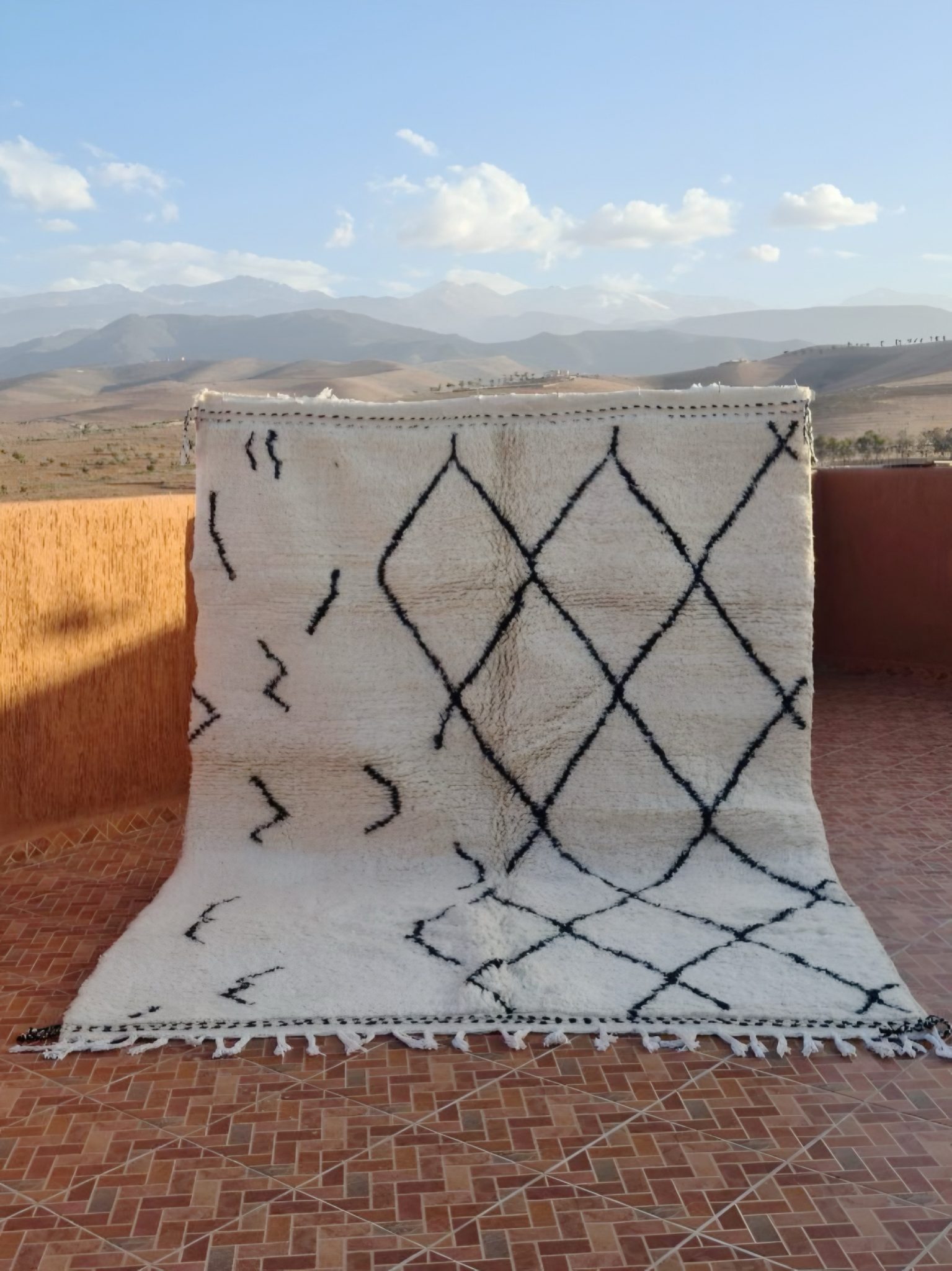 Moroccan Beni Ourain Rug – 3x2m | White with Black Diamond Pattern